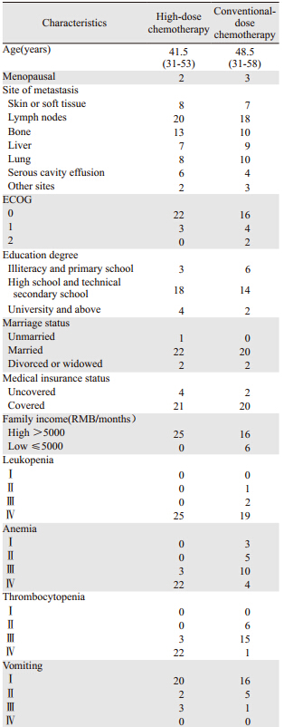 采用SPSS15.0统计软件进行统计分析。采用t检验对乳腺癌患者接受自体外周血造血干细胞支持下高剂量化疗与对照组得分进行比较。本研究数据采用双侧检验,以P<0.05为差异有统计学意义。2 结果2.1 本组乳腺癌患者特征