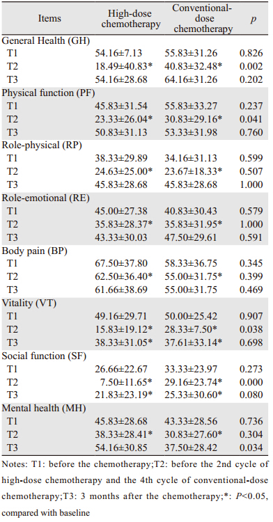 本研究中,高剂量化疗组患者与常规剂量化疗组比较,高剂量化疗组,PF、VT和SF较常规剂量组显著下降(P<0.05),而GH、RP、RE、BP及MH差异均无统计学意义(P>0.05)。化疗结束3月,大剂量化疗组与常规剂量组比较,大剂量化疗组MH较常规剂量组有显著改善,其他指标差异均无统计学意义。与化疗前基线水平比较,两组患者均表现为活力及社会功能显著下降。