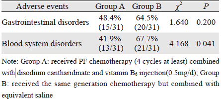 斑蝥酸钠维生素B6注射液的有效成分是斑蝥酸钠,可减少肿瘤细胞RNA和DNA前体物质的摄入,主要通过抑制肿瘤细胞DNA和RNA以及蛋白质的合成、并且刺激吞噬细胞和淋巴细胞产生细胞因子白细胞介素、增强效应细胞对肿瘤细胞的杀伤作用等机制,最终抑制肿瘤细胞生成和分裂,促进肿瘤细胞凋亡发挥其抗肿瘤活性[11]。本研究结果表明,联合斑蝥酸钠维生素B6注射液的晚期贲门癌患者,化疗后血浆D-二聚体含量明显低于对照组,且骨髓抑制的不良反应发生率较对照组有明显降低,证明斑蝥酸钠维生素B6可进一步降低化疗后患者体内血液的高凝状态,有效地减轻化疗不良反应。