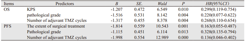 对可能影响患者预后的因素包括性别、年龄、KPS评分、手术切除程度、病理分级、手术至放疗开始间隔时间、放疗技术及TMZ辅助化疗周期数等临床及病理特征进行单因素分析,结果显示KPS评分、病理分级和TMZ辅助化疗周期数对OS的影响有显著性意义;年龄、手术切除程度、病理分级和TMZ辅助化疗周期数对PFS的影响有显著性意义,见表 2。