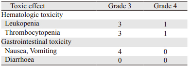 全组患者均完成同步放化疗方案。16例患者辅助TMZ化疗<6周期,其中5例患者因治疗期间出院进展或复发未完成预定周期数,11例患者因无法耐受严重不良反应而停止化疗。服用TMZ期间的不良反应主要为血液学及胃肠道等不良反应,见表 4。本组患者中未观察到肝、肾及心脏的相关毒性。