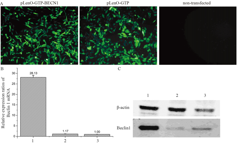 | 1: pLenO-GTP-BECN1; 2: pLenO-GTP; 3: non-transfected; A: the fluorescence expression of GFP in BT-549 cells (×100); B: the relative expression of Beclin 1 mRNA in BT-549 cells; C: the expression of Beclin 1 protein in BT-549 cells 图 1 慢病毒载体介导Beclin 1在BT-549细胞中稳定表达的情况 Figure 1 Stable expression of Beclin 1 in BT-549 cells via lentiviral vector |