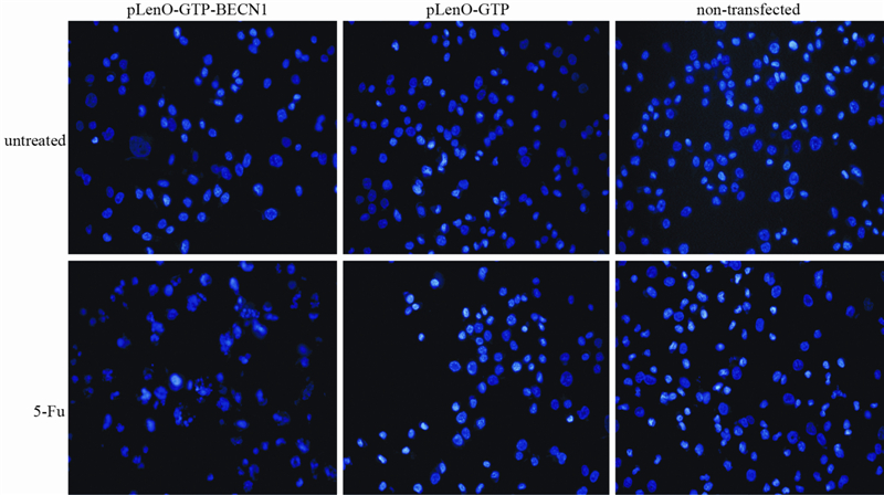 为了明确Beclin 1增强BT-549细胞对5-Fu的敏感度是否同凋亡相关,对5-Fu作用前后细胞凋亡情况进行检测。5-Fu作用前,pLenO-GTP-BECN1组凋亡率为(12.14±0.76)%,同pLenO-GTP组(13.57±1.04)%和空白组(13.75±1.29)%(F=2.096;P=0.204)之间差异并无统计学意义;5-Fu作用后,pLenO-GTP-BECN1组凋亡率为(51.01±3.26)%,显著高于pLenO-GTP组(42.17±4.6)%和空白组(38.42±2.93)%(F=9.32;P < 0.01),见图 3。Hoechst33342染色结果显示,5-Fu作用后BT-549细胞变圆,数目减少,细胞核均呈现为不均一的亮蓝色荧光,串珠状或分叶状,出现核染色质固缩、核裂解等凋亡特征性形态改变,尤以pLenO-GTP-BECN1组最为明显,见图 4。