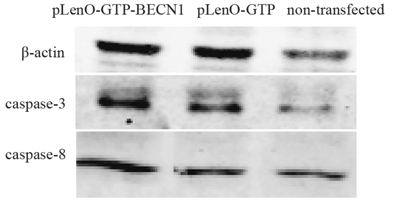 为了进一步研究5-Fu处理后凋亡发生情况,我们对凋亡相关蛋白Caspase-3和Caspase-8表达情况进行检测。5-Fu作用后,pLenO-GTP-BECN1组细胞Caspase-3相对表达量为(0.57±0.0028)显著高于pLenO-GTP组(0.42±0.010)和空白组(0.30±0.046)(F=46.134;P < 0.01); pLenO-GTP-BECN1组细胞Caspase-8相对表达量为(0.44±0.0038)显著高于pLenO-GTP组(0.18±0.0095)和空白组(0.27±0.00060)(F=1006.757;P < 0.00),见图 5。