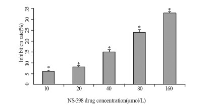 | *: P <0.05, compared with each other group 图 1 NS-398对HCT-8/Fu细胞的生长抑制作用 Figure 1Inhibition effect of NS-398 on growth of HCT-8/Fu cells |