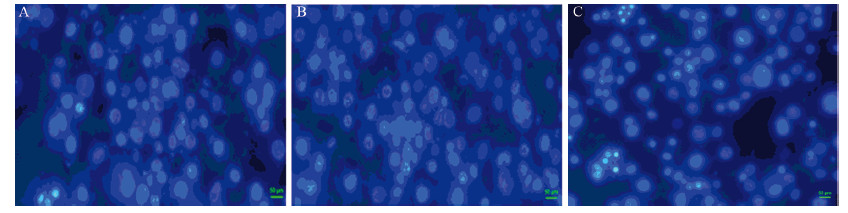 | A: 20μmol/L NS-398; B: 320μg/ml 5-Fu; C: 20μmol/L NS-398 + 320μg/ml 5-Fu 图 2 荧光倒置显微镜下观察不同药物作用24h后的细胞凋亡(×20) Figure 2Apoptotic effects of different drugs on HCT-8/Fu cells after 24h under inverted fluorescence microscope(×20) |