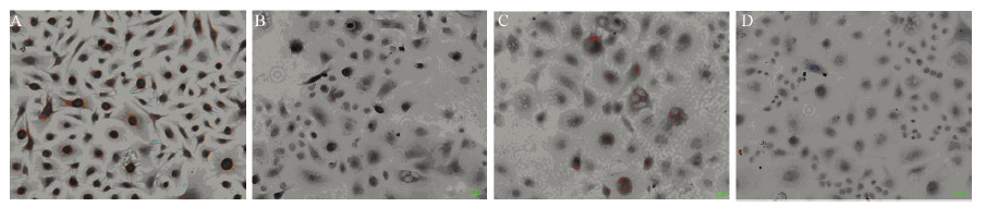 | A: MRP expression after treated by 0μmol/L NS-398 for 24h; B: MRP expression after treated by 20μmol/L NS-398 for 24h; C: P-gp expression after treated by 0μmol/L NS-398 for 24h; D: P-gp expression after treated by 20μmol/L NS-398 for 24h; P-gp: P-glycoprotein, MRP :multi-drug resistance related protein 图 3 NS-398作用24h后MRP和P-gp在HCT-8/Fu细胞的表达 Figure 3MRP and P-gp expression in HCT-8/Fu cells treated with NS-398 for 24h |