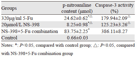 2.3 细胞Caspase-3活性检测不同药物作用后,酶标仪405 nm处测得底物裂解产生的荧光强度,通过标准曲线计算出20 μmol/L NS-398+320 μg/ml 5-Fu组pNA含量明显高于其他两组(320 μg/ml 5-Fu组,20 μmol/L NS-398组),数据统计表明,各分组药物可不同程度的诱导HCT-8/Fu细胞中Caspase-3活性水平上升,其中20 μmol/L NS-398+320 μg/ml 5-Fu组Caspase-3活性增加百分比同比320 μg/ml 5-Fu组和20 μmol/L NS-398组升高明显,差异具有统计学意义(分别为P=0.000和P=0.010),pNA含量及Caspase-3活性增加百分比,见表 1。