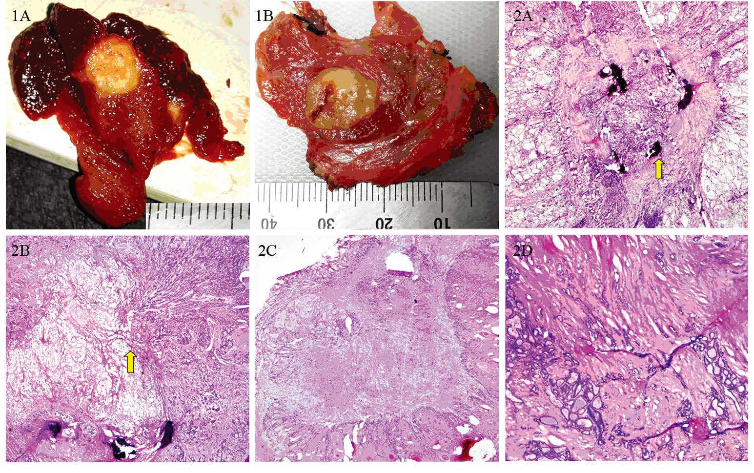 | 1A: PTMC had well circumscribed lesion. The cut surface was white and with granulated appearance in focal area; 1B: The thyroid adenoma also had clear boundary, the cut surface was white with red, or the majority was red with semi-transparent, but not granulated 图 1 PTMC肉眼观(1A)和甲状腺腺瘤肉眼观 (1B) Figure 1 Gross view of PTMC (1A) and adenoma of thyroid (1B) 2A: cancer cells densely grew as small papillae and glands with calcification (arrow) (HE ×40); 2B: the borderline was irregular, and showed pushing infiltrate pattern (arrow) (HE ×40); 2C: the borderline was round and blunt (HE ×40); 2D: the infiltrate growth of atypic and expansive glands in the hyperplasia and hyaline degeneration of fibrous background (HE ×200) 图 2 PTMC镜下观 (2A、2B、2D) 和甲状腺炎症性病变 (2C) Figure 2 Microscopic view of PTMC (2A,2B,2D) and thyroiditis lesion (2C) |