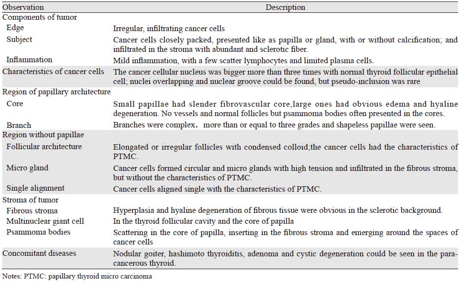2.4 冰冻切片显微镜下特点PTMC结构的异型性为诊断的关键,张力大的腺腔的出现及单一的背景为PTMC提供间接的诊断思路,见表 1。
